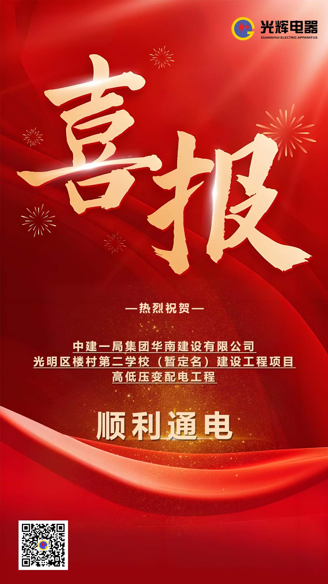 由深圳市光輝電器實業(yè)有限公司第一分公司履約的“中建一局集團華南建設有限公司光明區(qū)樓村第二學校(暫定名)建設工程項目高低壓變配電工程”,安全送電完成。